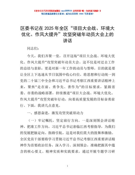 / 区委书记在2025年全区“项目大会战、环境大优化、作风大提升”攻坚突破年动员大会上的讲话