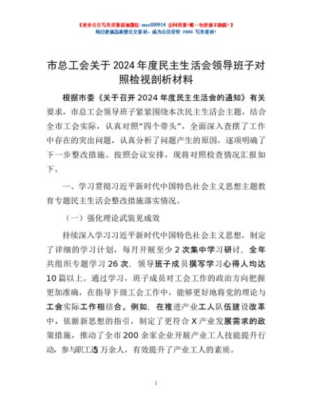 / 市总工会关于2024年度民主生活会领导班子对照检视剖析材料