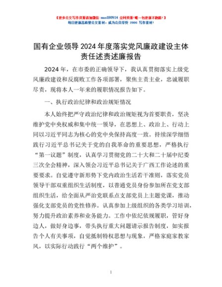 / 国有企业领导2024年度落实党风廉政建设主体责任述责述廉报告