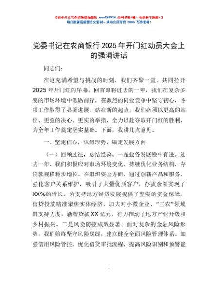 / 党委书记在农商银行2025年开门红动员大会上的强调讲话
