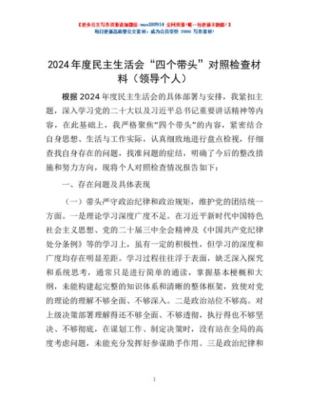 / 2024年度民主生活会“四个带头”对照检查材料(领导个人)