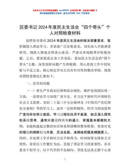 / 区委书记2024年度民主生活会“四个带头”个人对照检查材料