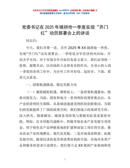 / 党委书记在2025年镇拼抢一季度实现“开门红”动员部署会上的讲话