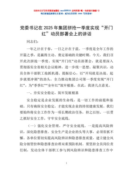 / 党委书记在2025年集团拼抢一季度实现“开门红”动员部署会上的讲话