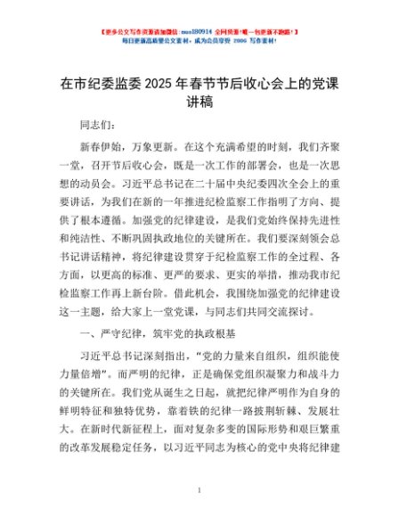 / 在市纪委监委2025年春节节后收心会上的党课讲稿