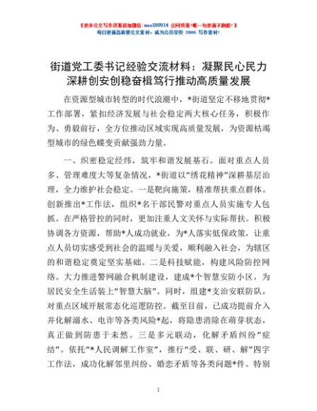 / 街道党工委书记经验交流材料:凝聚民心民力 深耕创安创稳 奋楫笃行推动高质量发展