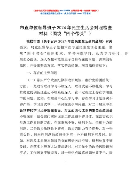 / 市直单位领导班子2024年民主生活会对照检查材料(围绕“四个带头”)