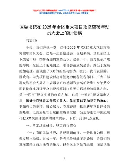 / 区委书记在2025年全区重大项目攻坚突破年动员大会上的讲话稿
