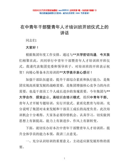 / 在中青年干部暨青年人才培训班开班仪式上的讲话