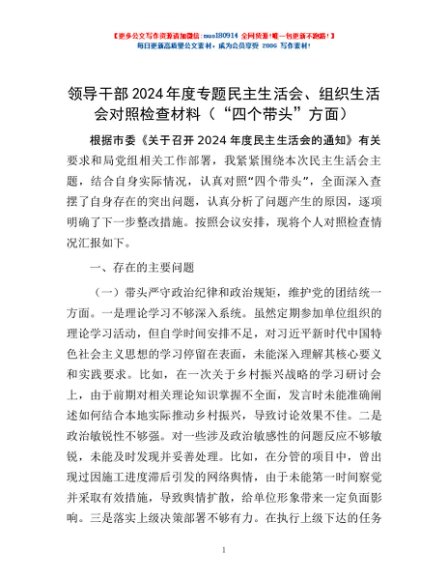/ 领导干部2024年度专题民主生活会、组织生活会对照检查材料(“四个带头”方面)