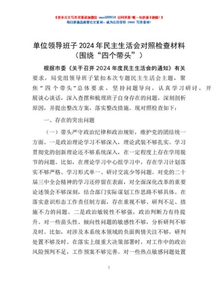 / 单位领导班子2024年民主生活会对照检查材料(围绕“四个带头”)