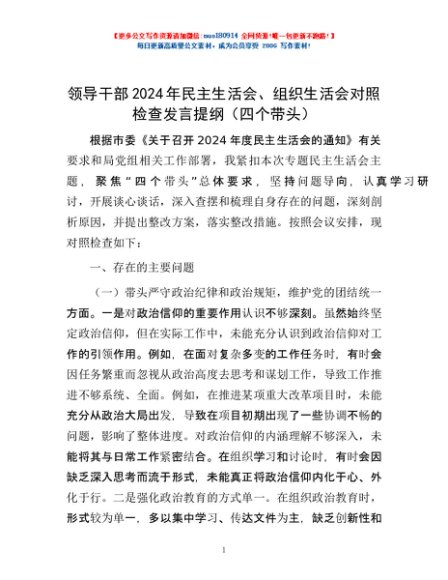 / 领导干部2024年民主生活会、组织生活会对照检查发言提纲(四个带头)
