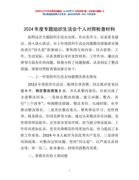 / 2024年度专题组织生活会个人对照检查材料