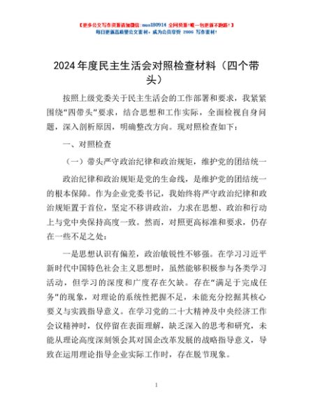 / 2024年度民主生活会对照检查材料(四个带头)