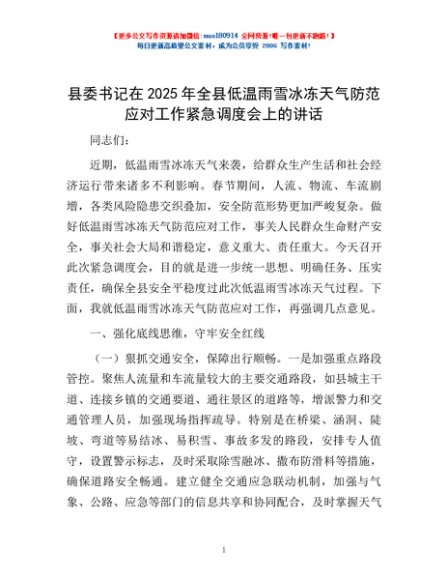 / 县委书记在2025年全县低温雨雪冰冻天气防范应对工作紧急调度会上的讲话