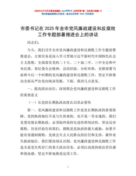 / 市委书记在2025年全市党风廉政建设和反腐败工作专题部署推进会上的讲话