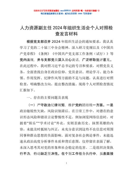 / 人力资源副主任2024年组织生活会个人对照检查发言材料