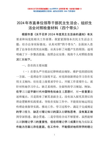 / 2024年市直单位领导干部民主生活会、组织生活会对照检查材料(四个带头)