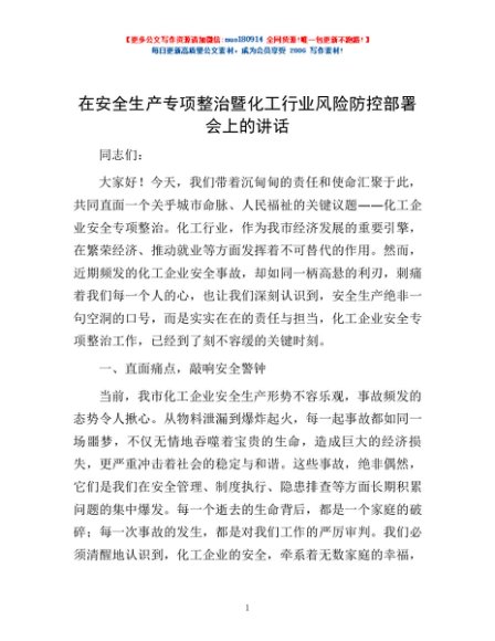 / 在安全生产专项整治暨化工行业风险防控部署会上的讲话
