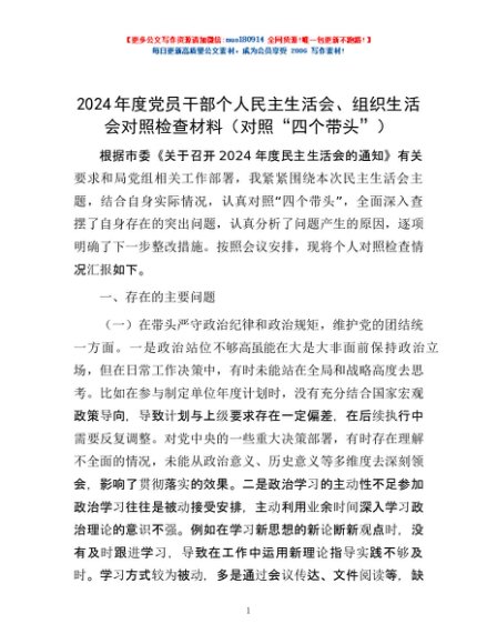 / 2024年度党员干部个人民主生活会、组织生活会对照检查材料(对照“四个带头”)