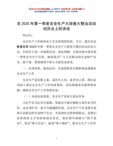 / 在2025年第一季度安全生产大排查大整治活动动员会上的讲话