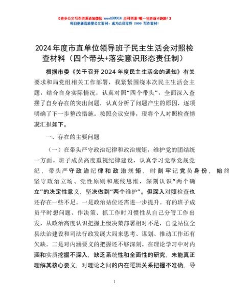 / 2024年度市直单位领导班子民主生活会对照检查材料(四个带头+落实意识形态责任制)