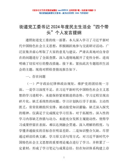 / 街道党工委书记2024年度民主生活会“四个带头”个人发言提纲