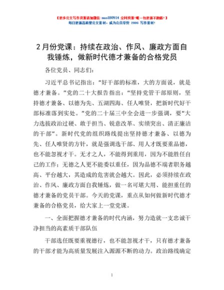 2月份党课:持续在政治、作风、廉政方面自我锤炼,做新时代德才兼备的合格党员
