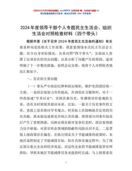 / 2024年度领导干部个人专题民主生活会、组织生活会对照检查材料(四个带头)