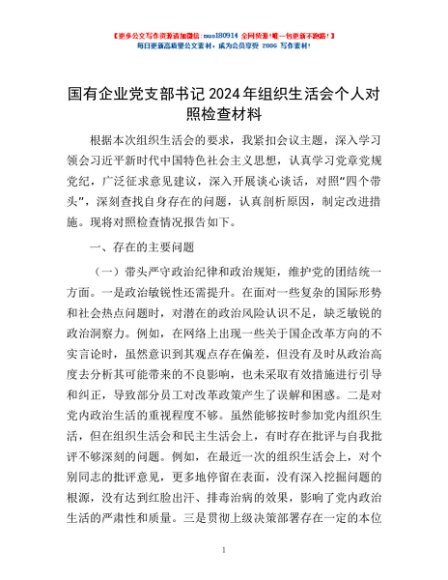 / 国有企业党支部书记2024年组织生活会个人对照检查材料