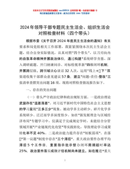 / 2024年领导干部专题民主生活会、组织生活会对照检查材料(四个带头)