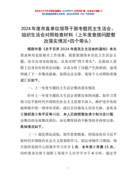 / 2024年度市直单位领导干部专题民主生活会、组织生活会对照检查材料(上年度查摆问题整改落实情况+四个带头)