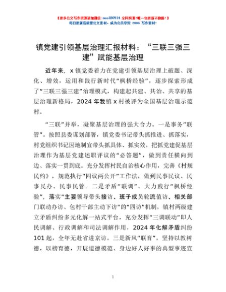 / 镇党建引领基层治理汇报材料:“三联三强三建”赋能基层治理