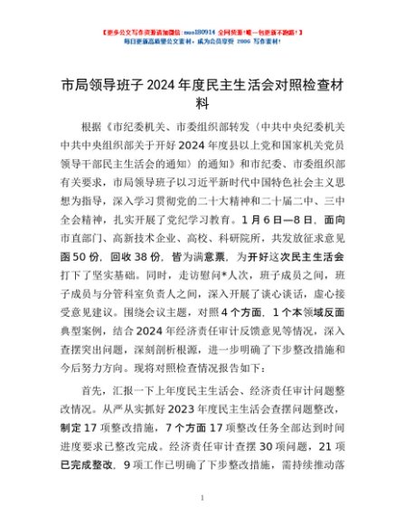 / 市局领导班子2024年度民主生活会对照检查材料