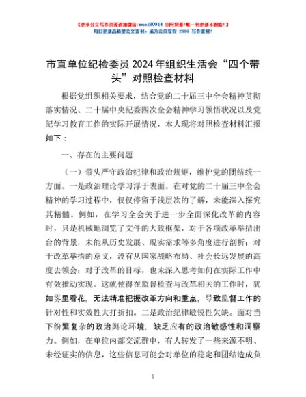 / 市直单位纪检委员2024年组织生活会“四个带头”对照检查材料