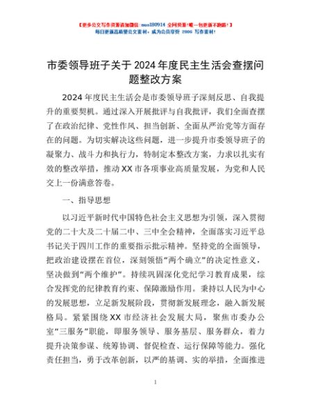 / 市委领导班子关于2024年度民主生活会查摆问题整改方案