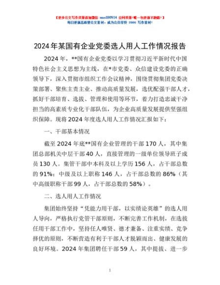 / 2024年某国有企业党委选人用人工作情况报告