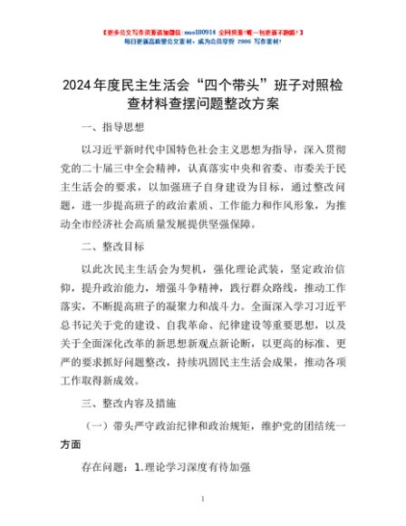 / 2024年度民主生活会“四个带头”班子对照检查材料查摆问题整改方案