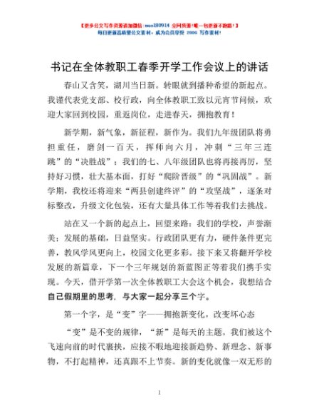 / 书记在全体教职工春季开学工作会议上的讲话