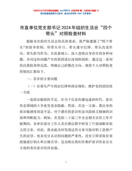 / 市直单位党支部书记2024年组织生活会“四个带头”对照检查材料