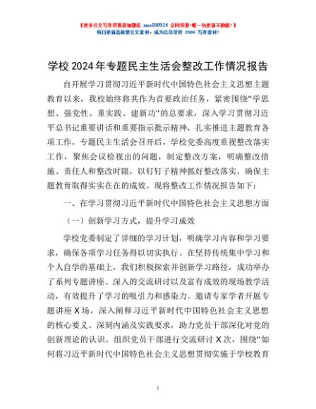 / 学校2024年专题民主生活会整改工作情况报告