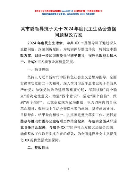 / 某市委领导班子关于2024年度民主生活会查摆问题整改方案