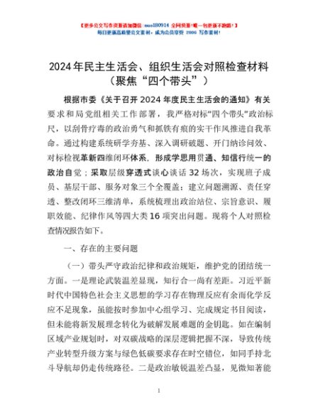 / 2024年民主生活会、组织生活会对照检查材料(聚焦“四个带头”)