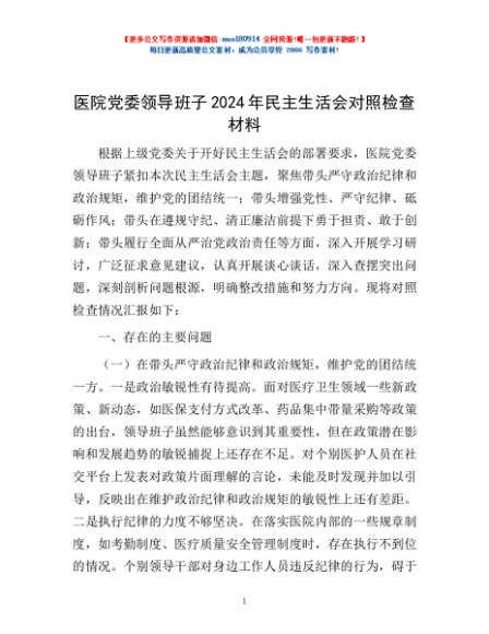 / 医院党委领导班子2024年民主生活会对照检查材料