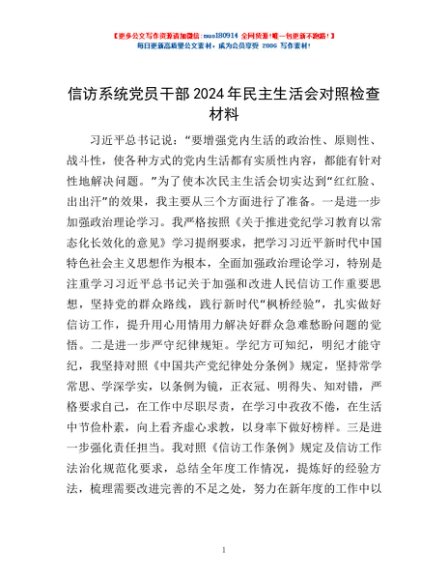 / 信访系统党员干部2024年民主生活会对照检查材料
