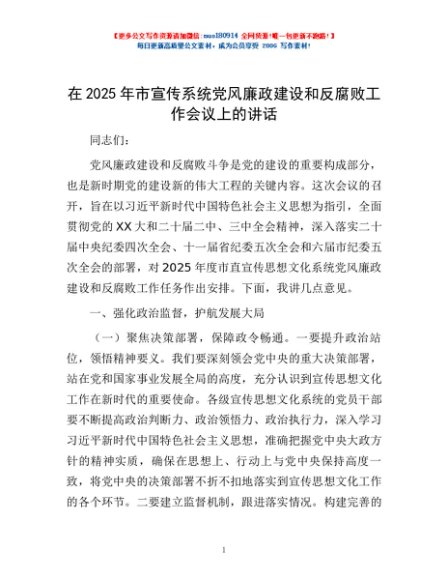 / 在2025年市宣传系统党风廉政建设和反腐败工作会议上的讲话