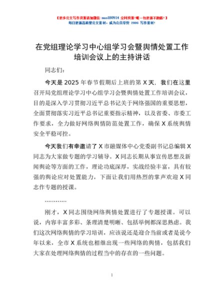 / 在党组理论学习中心组学习会暨舆情处置工作培训会议上的主持讲话