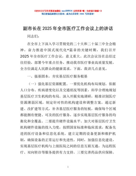 / 副市长在2025年全市医疗工作会议上的讲话