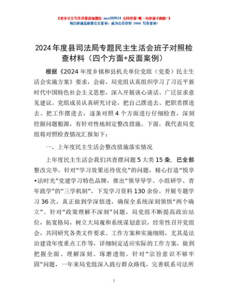 / 2024年度县司法局专题民主生活会班子对照检查材料(四个方面+反面案例)