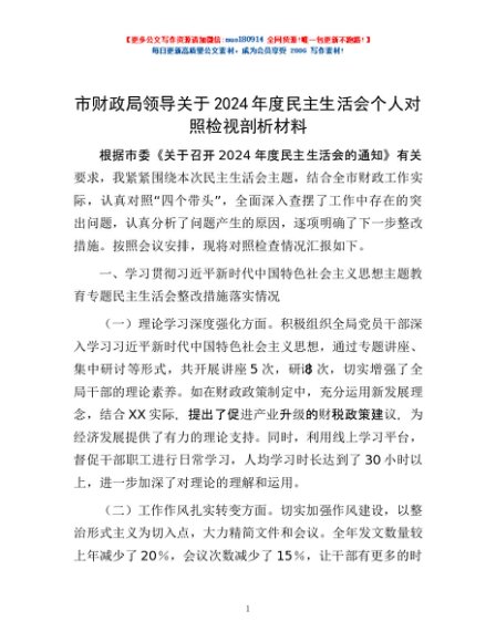 / 市财政局领导关于2024年度民主生活会个人对照检视剖析材料